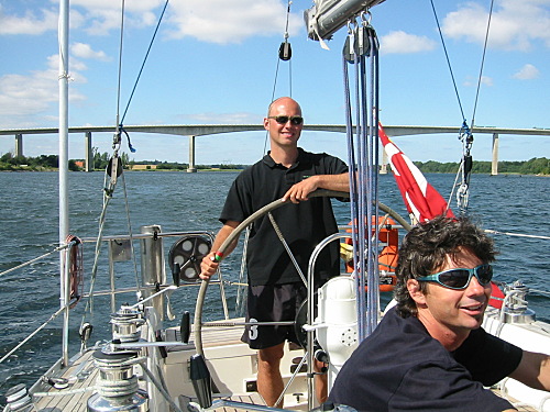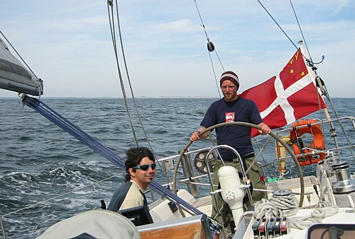 We really wanted our engine back so we'd have a fair chance of getting into haven with the boat still floating. We brought a wind charger, which wasn't mounted yet but with a little work it might just help us out. Tim took the wheel and I started to work on the regulator while Claus assembled the windmill. After a short while we had it all ready to charge the batteries but nothing to mount it on since we got rid of the pole in Klintholm, expecting a new one to arrive in Aabenraa. So we had to hold it with our hands. While Tim tacked into Femersund Claus and I sat on the side of the boat holding a small windmill that weighs about 20-25kg. It's shaped like a regular windmill, which makes it kinda hard to hold with the rotating blades and all and we had to change side every time Tim turned the boat. After a while we actually began to look forward to the turns because it gave us a chance to rest our arms for a second before getting the windmill to the other side of the boat.