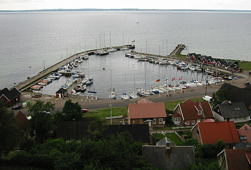 Der var ingen pladser i Backviken. Vi måtte navigere rundt i den meget lille havn mens færgen fra Sverige kom ind. Meget lidt plads for en urutineret, men det gik. Vi går efter Kyrkbacken, havnen på Hvens vest kyst.