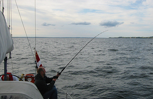 Vi er på vej mod lynetten. Det lykkedes os at fange to mindre torsk. Vores første torsk. Scheibel fangede den første jeg fangede den anden ... og indimellem fangede vi ankeret et par gange fordi båden drejede rundt om ankeret. Vinden er stadig fin.